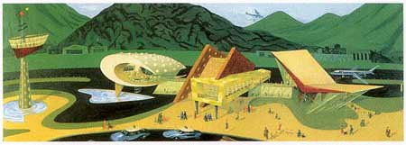Pollyea House. Georgeanne Deen. Architect: Kanner Associates. Gouache, 20cm 30cm The landscape and urban-allegory paintings from the 1930s of American Thomas Hart Benton (to say nothing of numerous more modern pop culture references!) echo through the work of this unique artist. By unusual composition and use of skewed perspective, Los Angeles-based artist Georgeanne Deen captures the exuberant intent of the design architects in a witty and entirely appropriate manner.