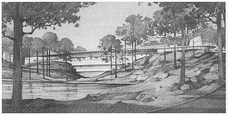 Proposed Corporate Headquarters, Armonk, New York. (1995) T.W. Schaller. Architects: Kohn Pedersen Fox. Watercolor and pencil, 42.9cm 66.3cm A slightly distant and decidedly horizontal visual treatment of this schematic design was chosen to contrast with the verticality and emphasize the calm of the heavily wooded earth-bound site.