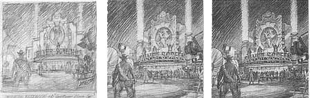 Silver Screen Junction. (1994) Steve Parker. Architects: Hellmuth, Obata, & Kassabaum Sports Facilities Group, Kansas City, Missouri. Various media, each: 25.6cm 25.6cm This developmental series of progress sketches by a gifted and facile architect/artist, Steve Parker, clearly demonstrates the value of hand-done drawing in the evolution of a design scheme.