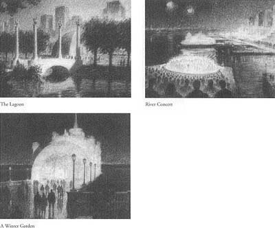 Three Manhattan Waterfront Views: New York Waterfront Competition, The Municipal Art Society, New York City: (1987) Artist/Designer: Richard Lovelace. Charcoal on tracing paper, each: 20.5cm 25.6cm These views perfectly illustrate the need of the image used in a design competition to impart a story boldly and with utmost impact; the tale here, told primarily by a masterful control of the effects of light, is as much about the proposal's contextual impact and emotive effect as about any design specifics. It is a powerful and economic interpretation of form and space.