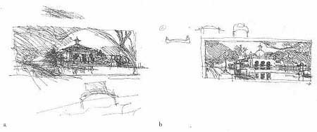 Merang Laguna Resorts, Malaysia. (1996) Christopher Grubbs. Architects and Planners: Wimberly Allison Tong & Goo, Honolulu, Hawaii. Ink on paper, a and b: 11.7cm 27.3cm; c, d, and e: 15.6cm 40.95cm In this fascinating series of lucid and accomplished sketches, we not only see a representation of process, but we can truly see process itself. We see a design evolving in perspective, evolving at home in its site, and before our eyes. Though undeniably more skilled than many, this artist/designer offers a most convincing argument for this book's major premise; that there is really very little substitute for the designer who can "think on paper."