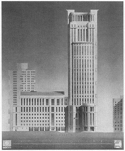 U.S. Federal Courthouse Competition, Foley Square, New York City, Rendered Elevational View. (1993) Elizabeth Ann Day. Architects: Kohn Pedersen Fox. Watercolor, 102.5cm 76.9cm "Without the visual clues available to the artist in perspective drawings," writes Day, "it is essential to optimize, even exaggerate, the limited range of spatial cues in a rendered elevation to imply the three-dimensional form."