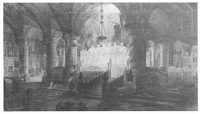 The Tomb of Merlin. (1814) Artist/Designer: Joseph Michael Gandy. Watercolor, 76cm 132cm; Courtesy of the Trustees of Sir John Soane's Museum and The British Architectural Library, RIBA, London. Light was the "essential" idea, the emotional touchstone, of much of this great Romantic artist's output and never more evident than in this astonishing work of art inspired by Ariosto's Orlando Furioso. The cold, dark stone of the tomb is transformed here into a great source of light, warmth, and life which is visually and symbolically rich in meaning.