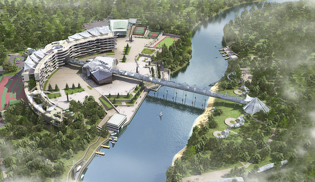 Зона культурных мероприятий – в центральной части территории. С востока в виде подковы огибает зона рекреации, в которую входит песчаный пляж с аквагоркой, зона спортивной рыбалки, беседки, выполненные в виде легких тентовых конструкций, зона для боулдеринга (экстримального скалолазанья). И все эти зоны, расположенные на двух противоположных берегах реки, пронизывает «стрела» пешеходного моста. Каждая функциональная зона комплекса имеет свои подъезды и подходы (пешеходные тротуары).