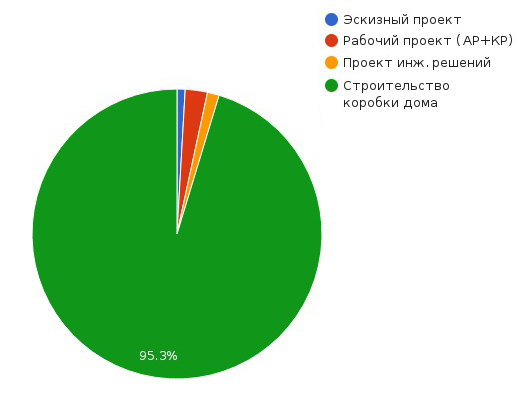 Как правило, стоимость качественного рабочего проекта в полной комплектации в процентном соотношении составляет порядка 5% от стоимости строительства "коробки" дома. Эскизный проект - 0,8%, архитектурный проект - 0,9%, проект конструктивных решений - 1,4%, проекты инженерных решений - 1,9%.