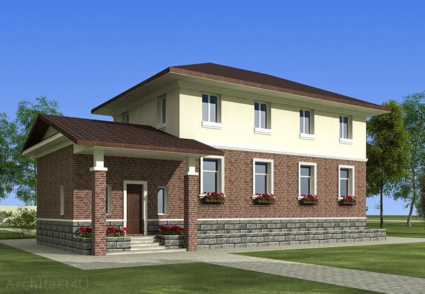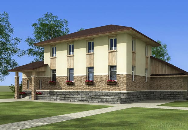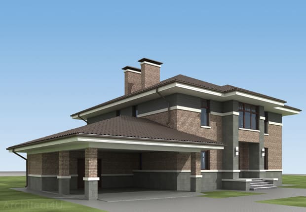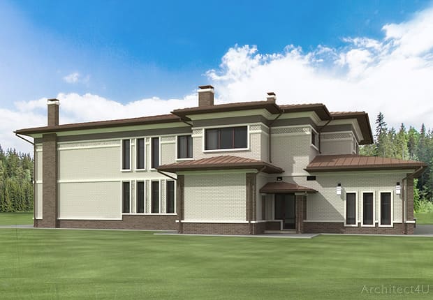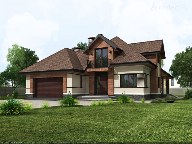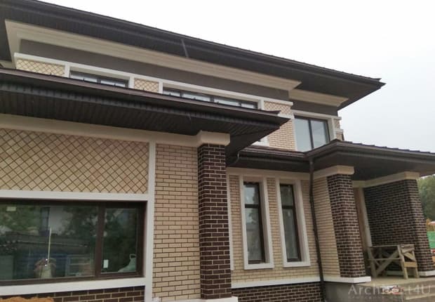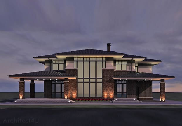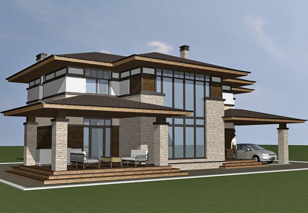 Посмотрите наш образец эскизного проекта отделки фасадов двухэтажного жилого дома в стиле Райта в Московской области.