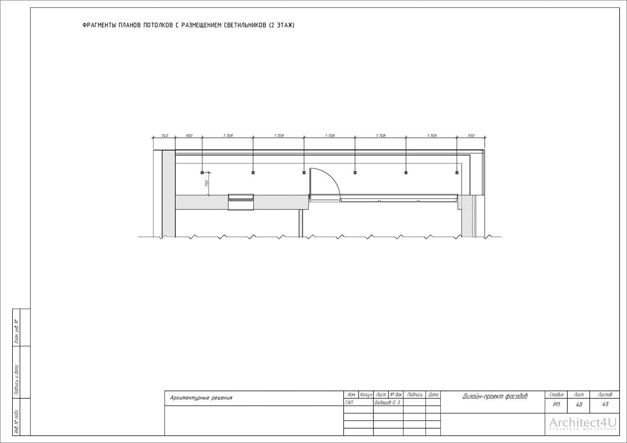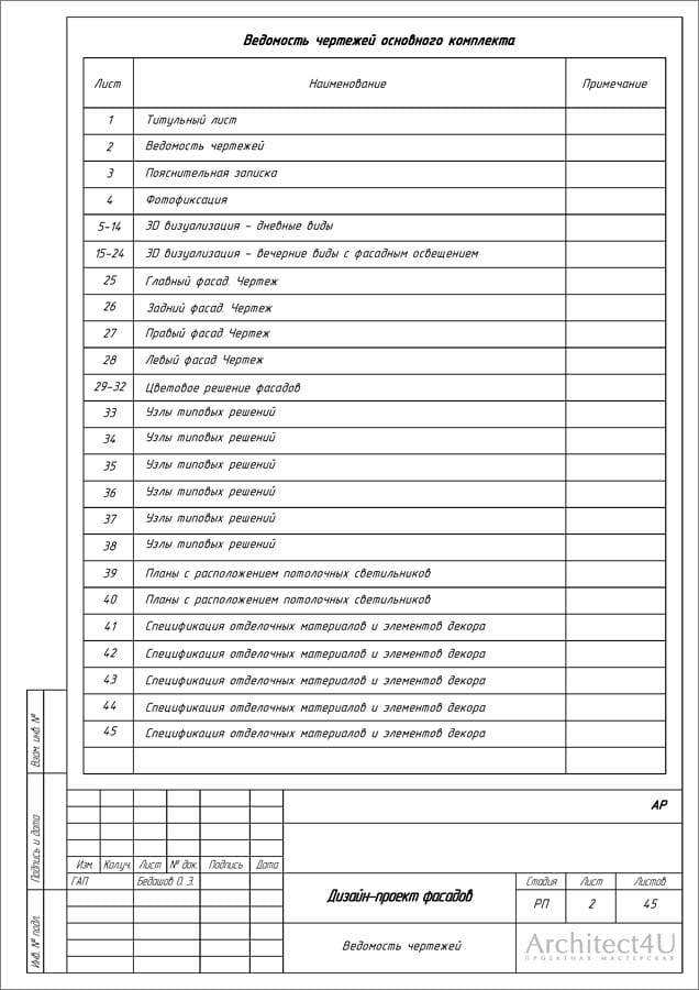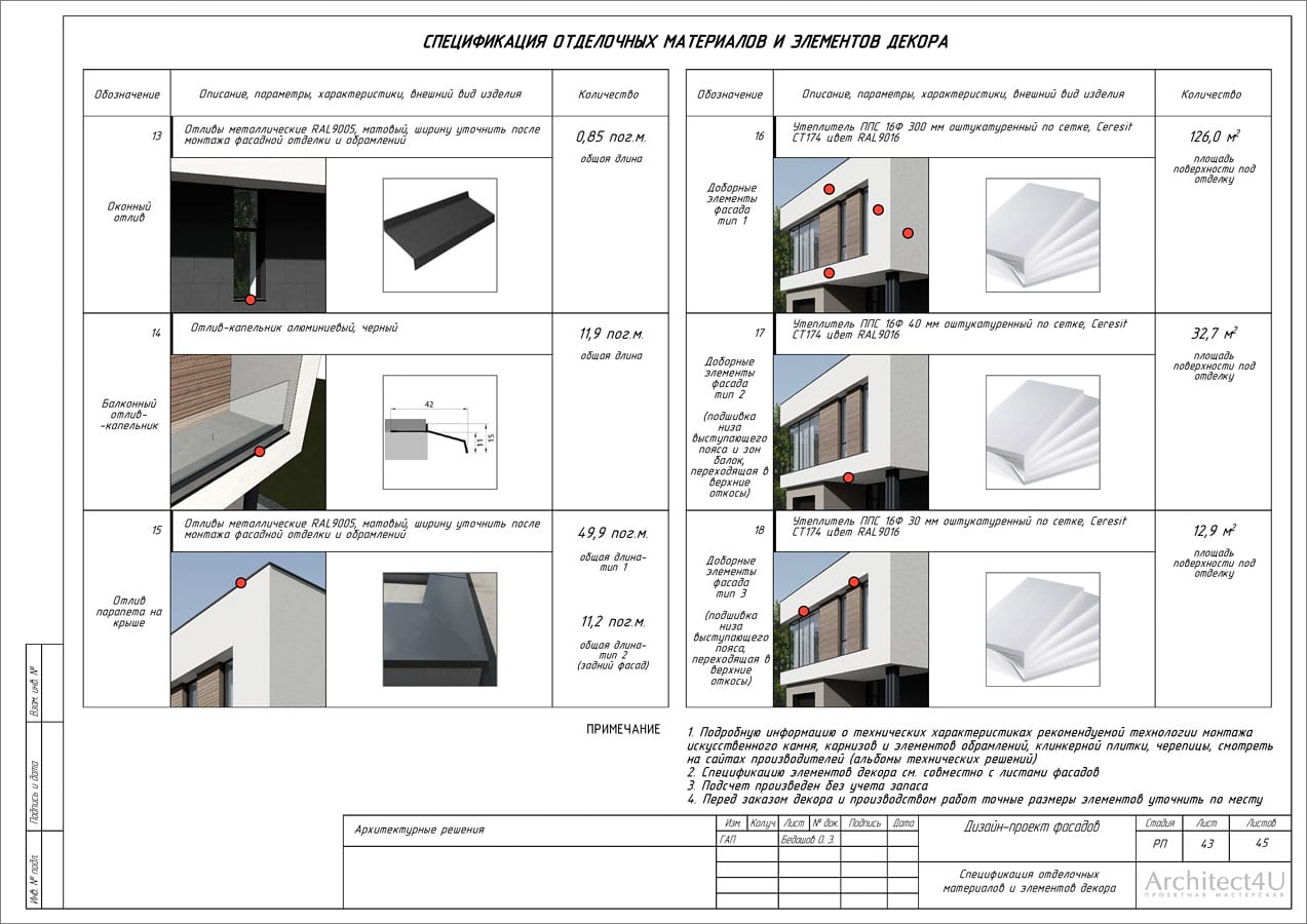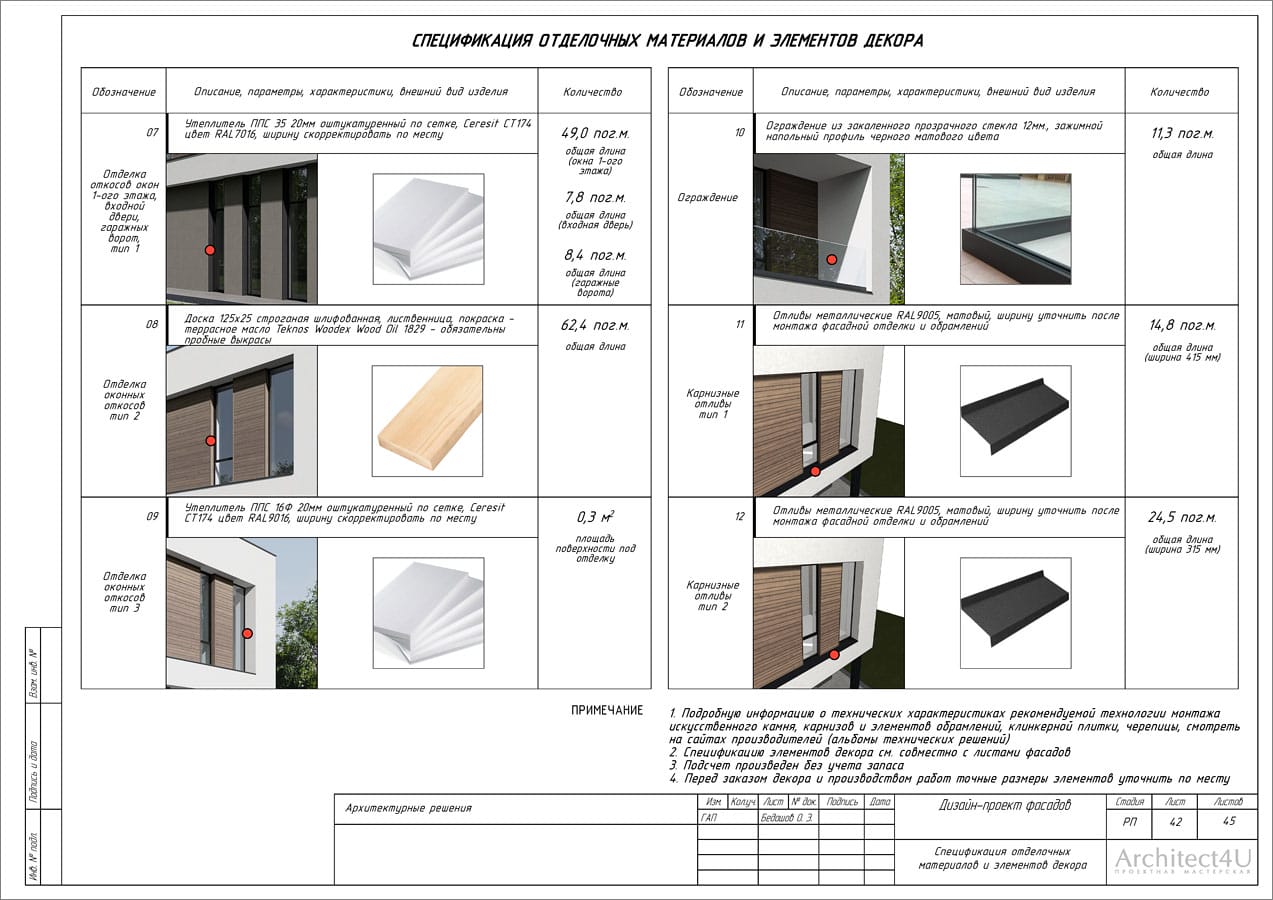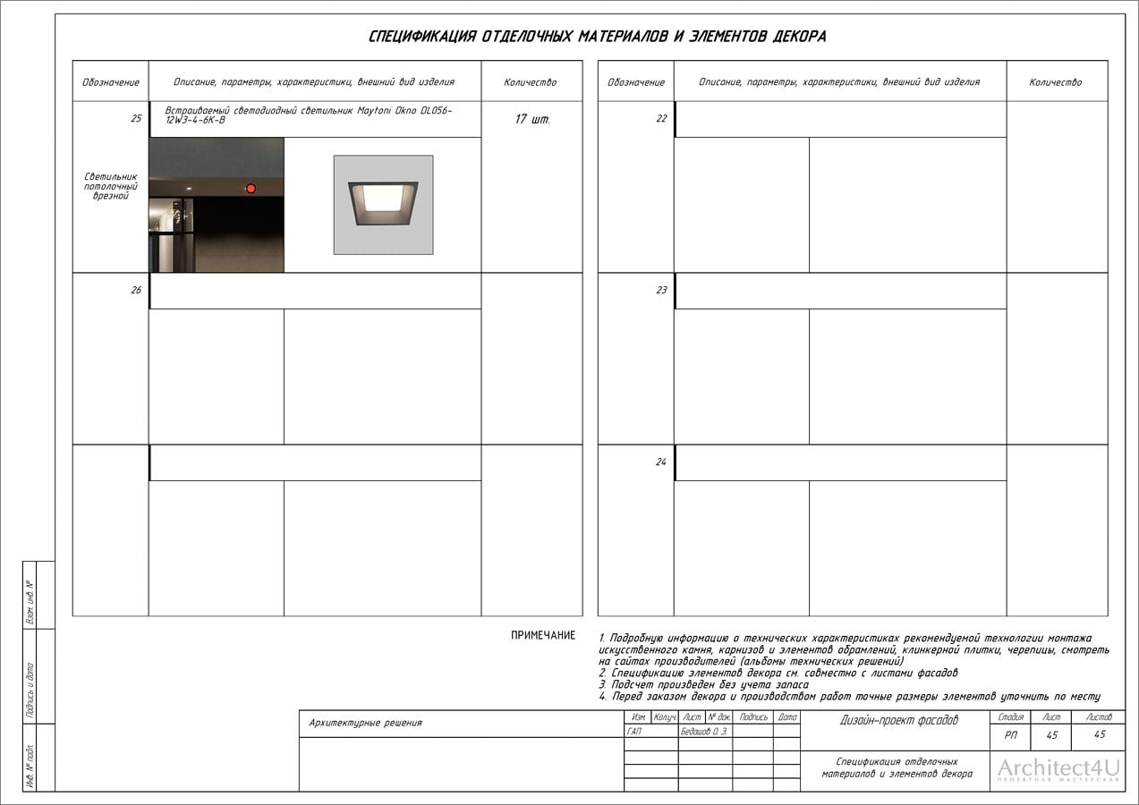 - расчет площадей покрытий, погонаж элементов (ведомость отделочных материалов, декоративных элементов и фасадных светильников)