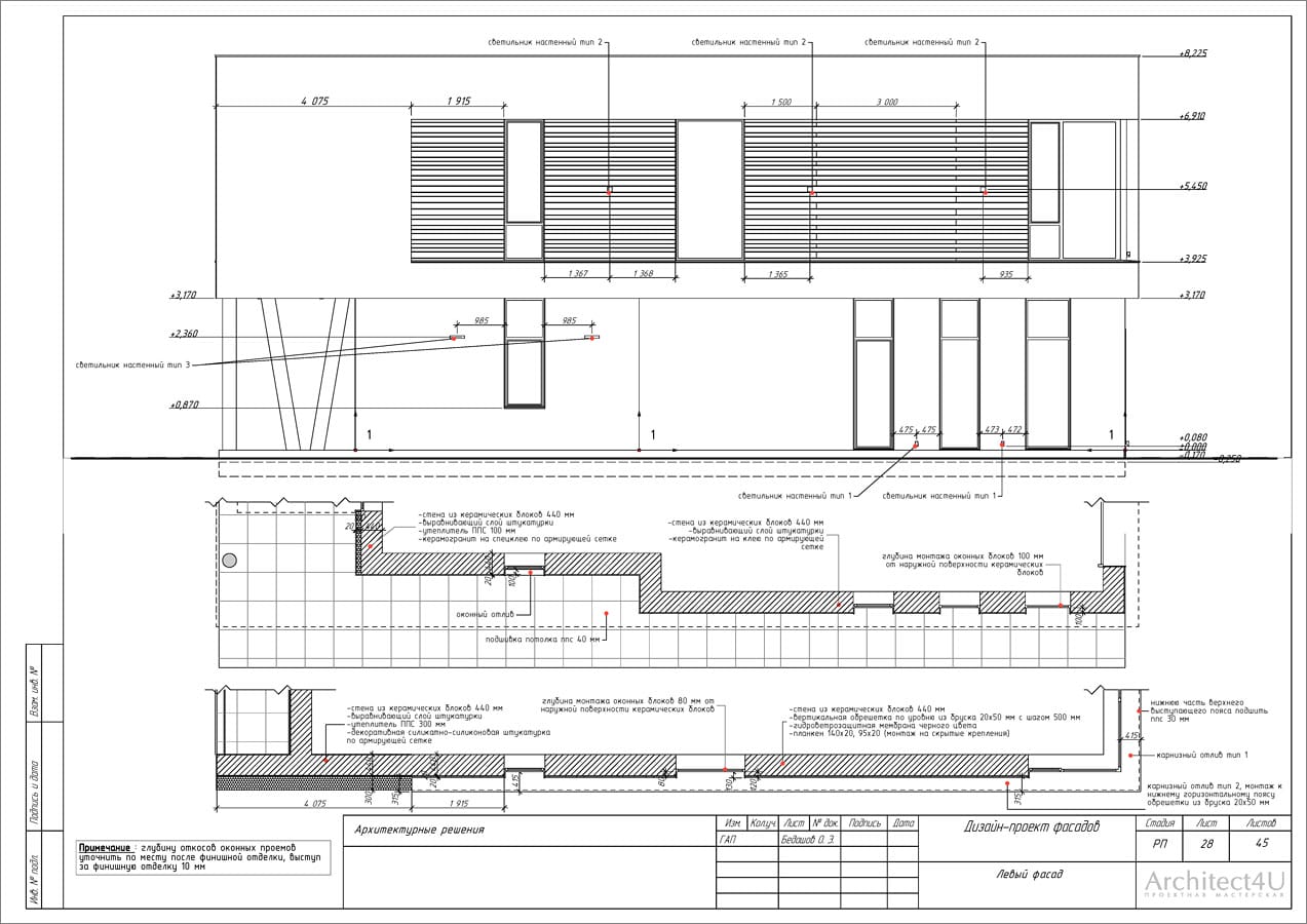 - проект необходимый для закупки материалов, фасадных светильников и выполнения строительно-отделочных работ, содержит все необходимые чертежи и расчеты