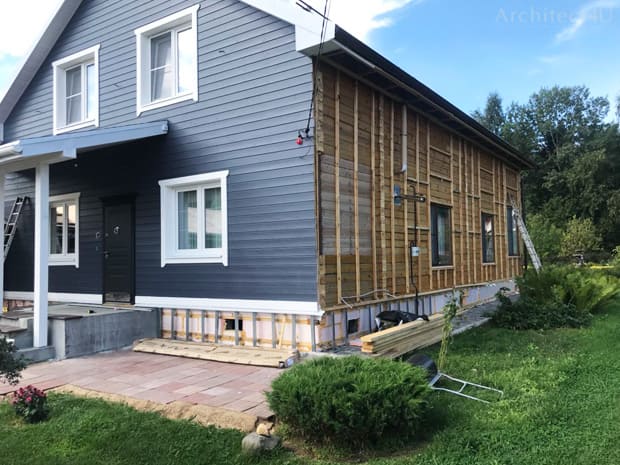Иногда клиент приобретает готовый проект дома и его практически всё в нем устраивает - материал несущих стен, площадь и расположение помещений, их ориентация по сторонам света и т.д. Всё, кроме внешнего вида дома, который хотелось бы переделать. Придумать более интересные и стильные решения с использованием современных отделочных материалов, добавить статуса. Бывает, что одна задача реконструкции дома подтягивает за собой другую. Например, переделываем входную группу или террасу, при этом затрагиваются фасады, которые также нужно продумать одновременно и комплексно.