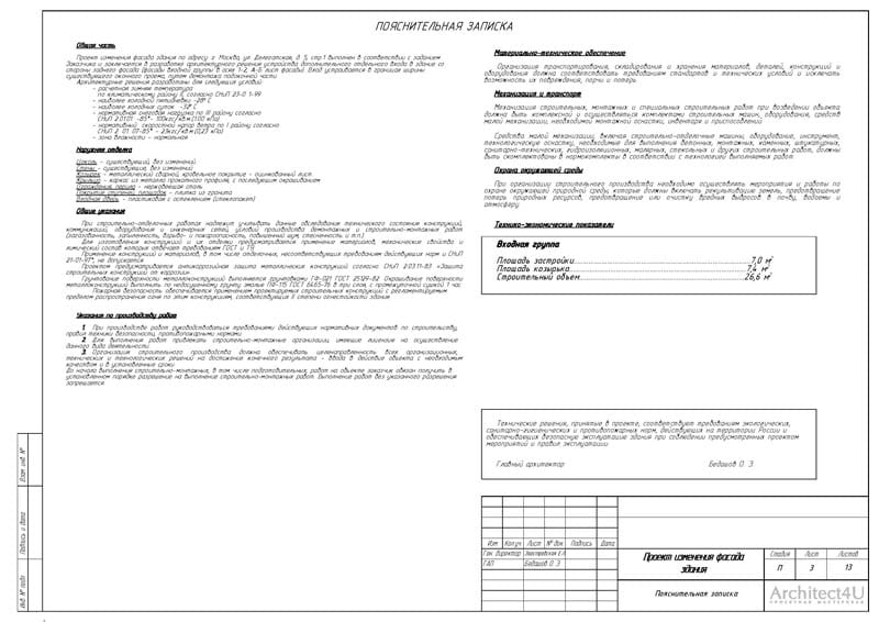 Общая пояснительная записка (ОПЗ)Содержит в своем составе общие данные о проектируемом объекте, ТЭП (технико-экономические показатели), указания по производству работ, требования к материально-техническому обеспечению, механизации и транспорту, охране окружающей среды |