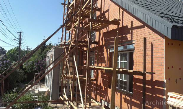 Фотография фасадов дома со стороны столовой. В процессе строительства