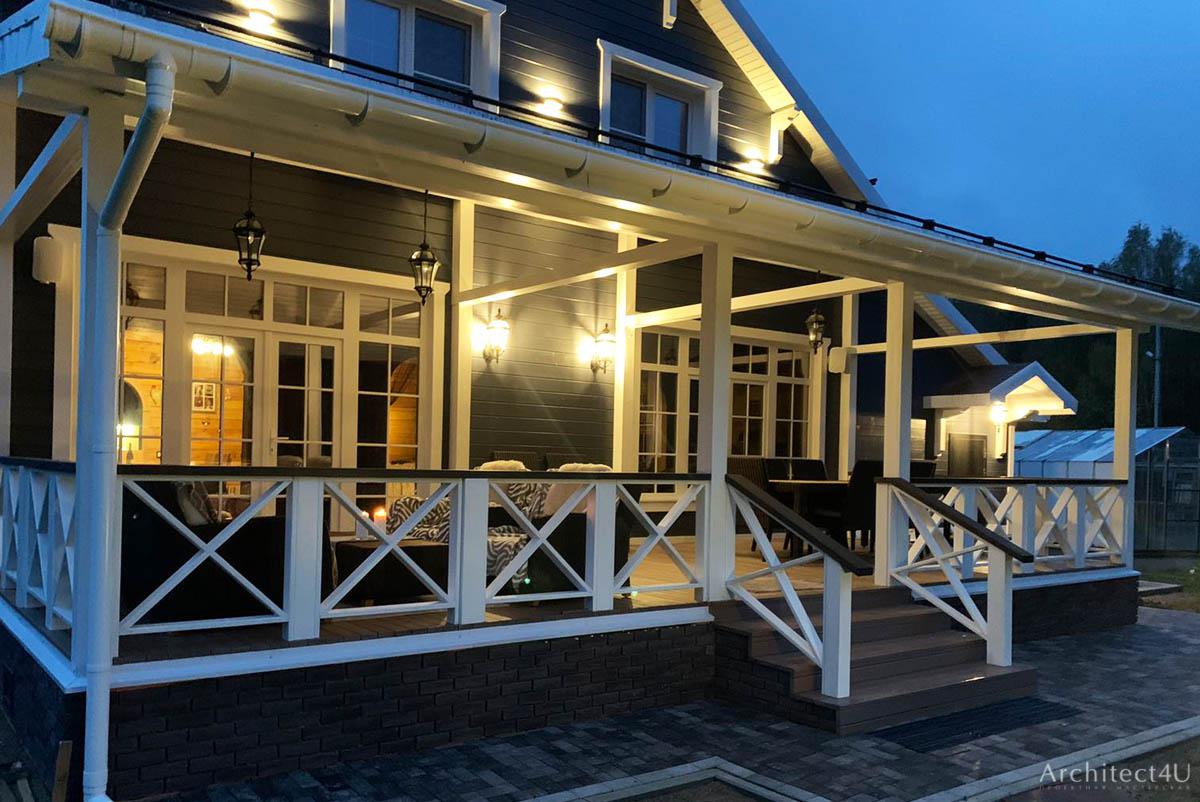 Фотография со стороны сада. Все желания заказчика были реализованы и воплощены в реальность. Теперь на большой террасе удобно собираться всей семьей и с компанией друзей. Согласно проекту помимо отделки, были заменены окна, решена функциональная и декоративная фасадная подсветка дома