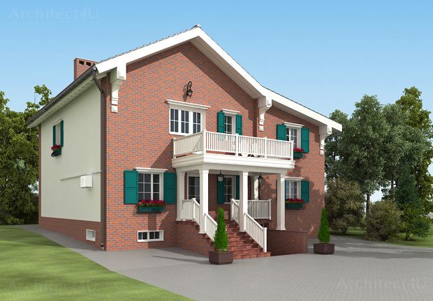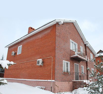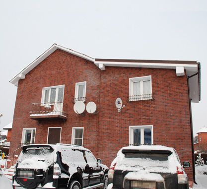 Кирпичный загородный дом для проживания двух семей. Главный фасад и один из боковых фасадов облицованы клинкерной плиткой Feldhaus Klinker (Германия). Кровельное покрытие - металлочерепица.