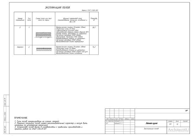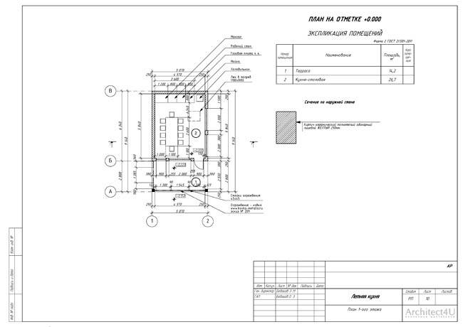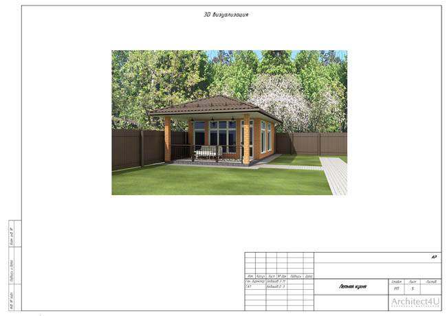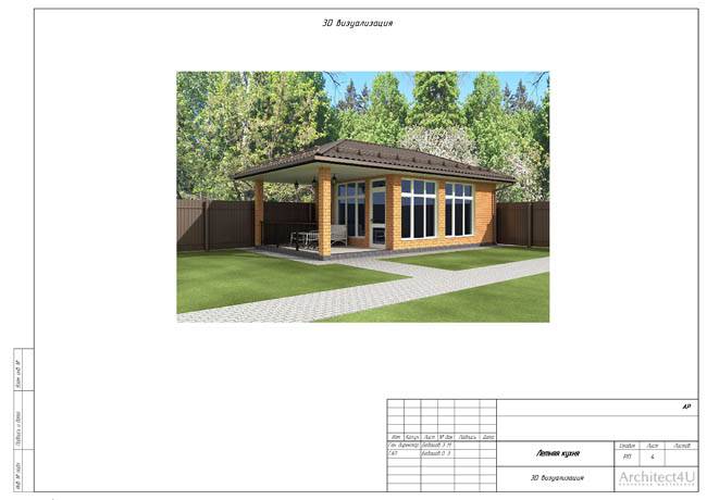 В качестве образца для ознакомления размещаем проект архитектурных решений летней кухни. По согласованию с заказчиком дополнительно могут быть изготовлены рабочие проекты конструктивных и инженерных решений. Стоимость рассчитывается в индивидуальном порядке на основании техзадания на проектирование.