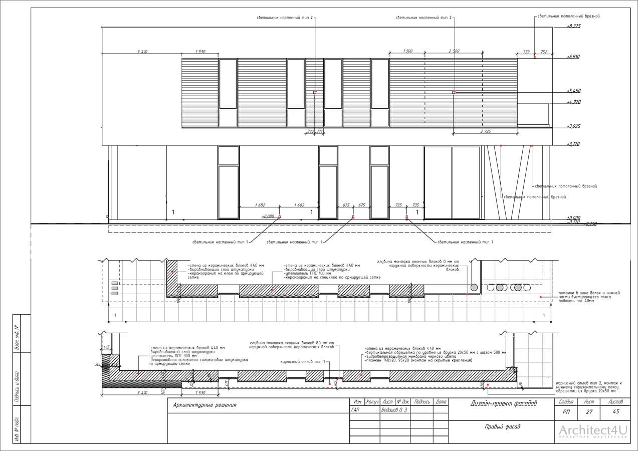 - проект необходимый для закупки материалов, фасадных светильников и выполнения строительно-отделочных работ, содержит все необходимые чертежи и расчеты