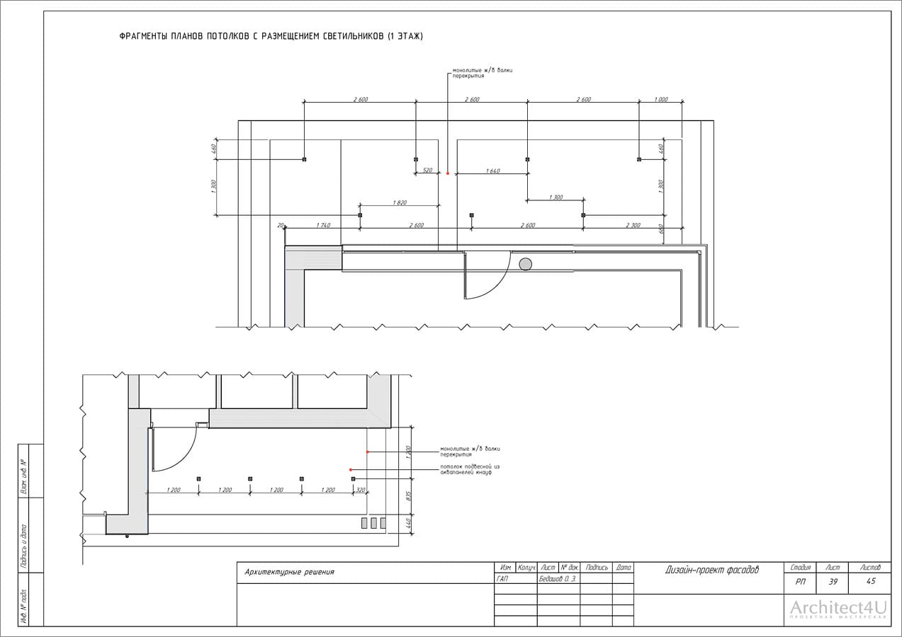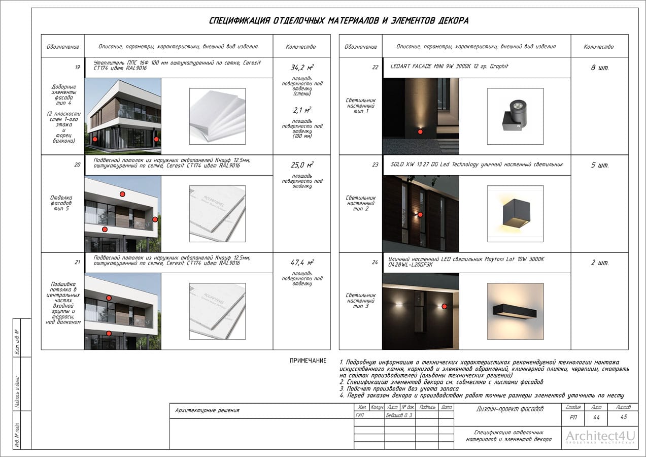 - расчет площадей покрытий, погонаж элементов (ведомость отделочных материалов, декоративных элементов и фасадных светильников)