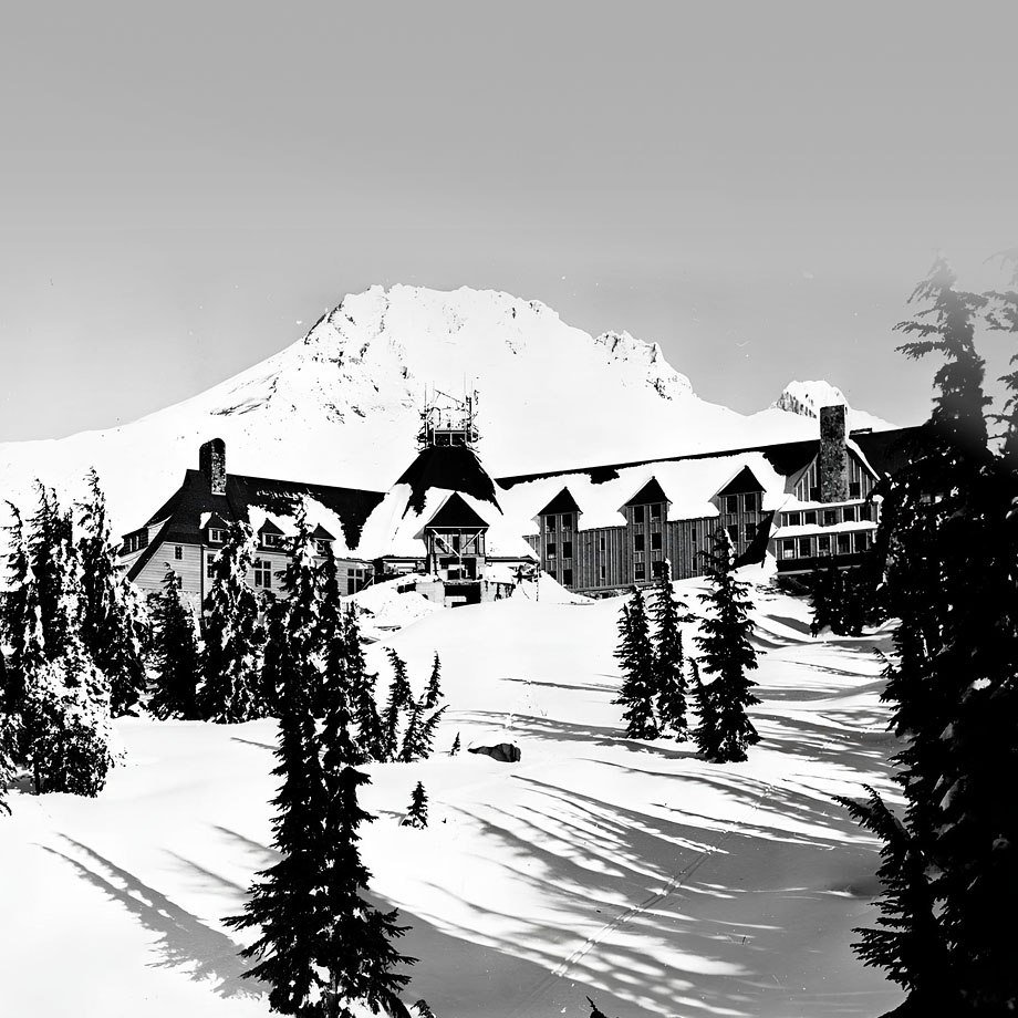 Timberline Lodge был построен в 1937 году в рамках программы New Deal у подножия горы Худ. Его архитектура относится к направлению каскадного рустикализма: массивное каменное основание, тяжёлые деревянные балки, крутые кровли и общее ощущение крепости, рассчитанной на противостояние стихии.