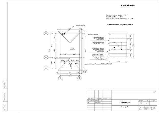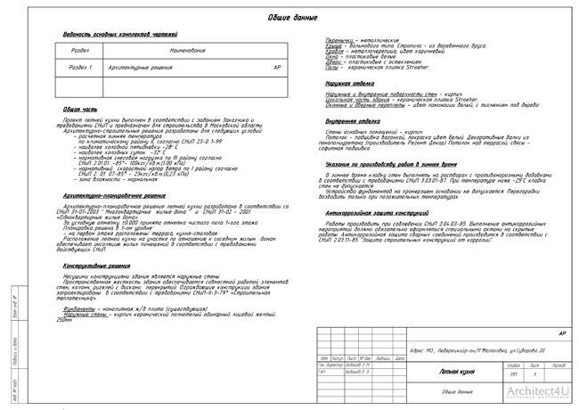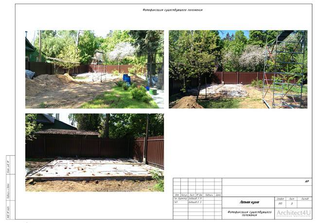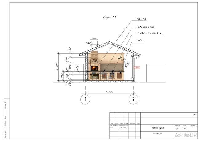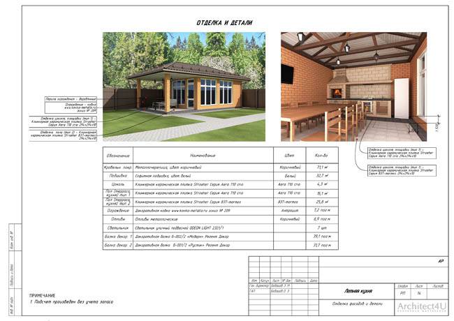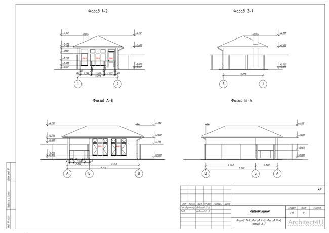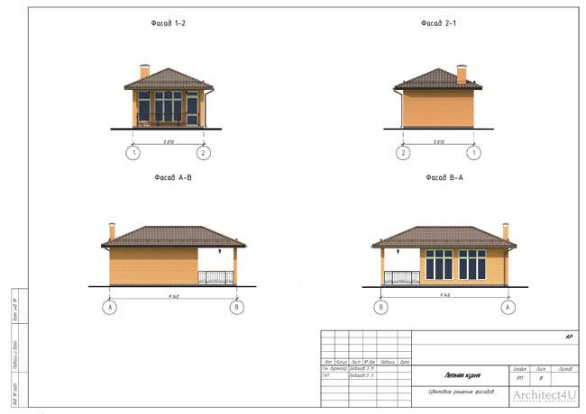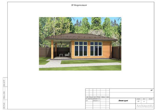 В качестве образца для ознакомления размещаем проект архитектурных решений летней кухни. По согласованию с заказчиком дополнительно могут быть изготовлены рабочие проекты конструктивных и инженерных решений. Стоимость рассчитывается в индивидуальном порядке на основании техзадания на проектирование.
