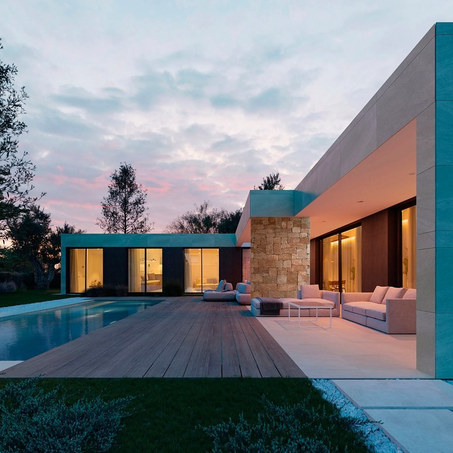 Главный визуальный акцент дома - фасад. Его средиземноморский характер раскрывается через игру материалов: технологичная древесина, керамогранит и натуральный камень формируют выразительный контраст, добавляя объёму глубину и тактильность. Дом выглядит современно, но при этом органично вписывается в местный ландшафт.