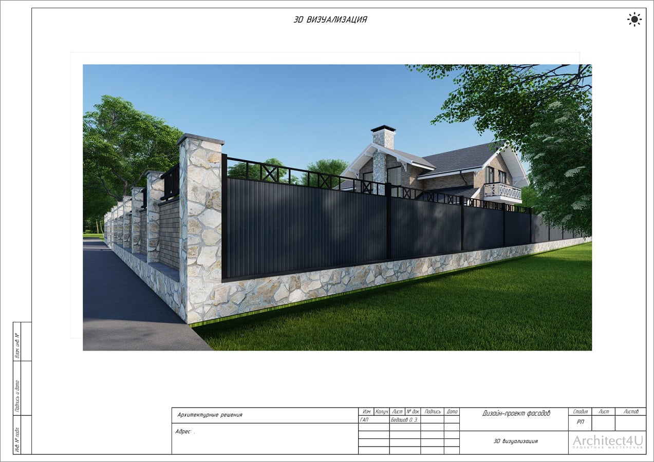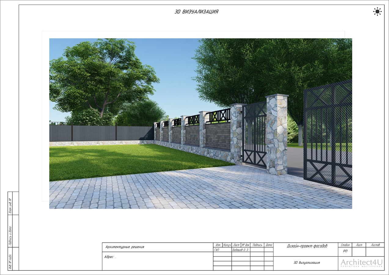 В минимальную комплектацию входит разработка вариантов концепции забора (ограждения), создание 3d визуализаций, подготовка основных чертежей - фасады, планы.