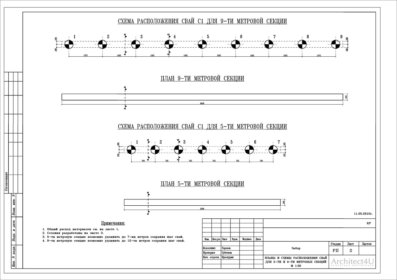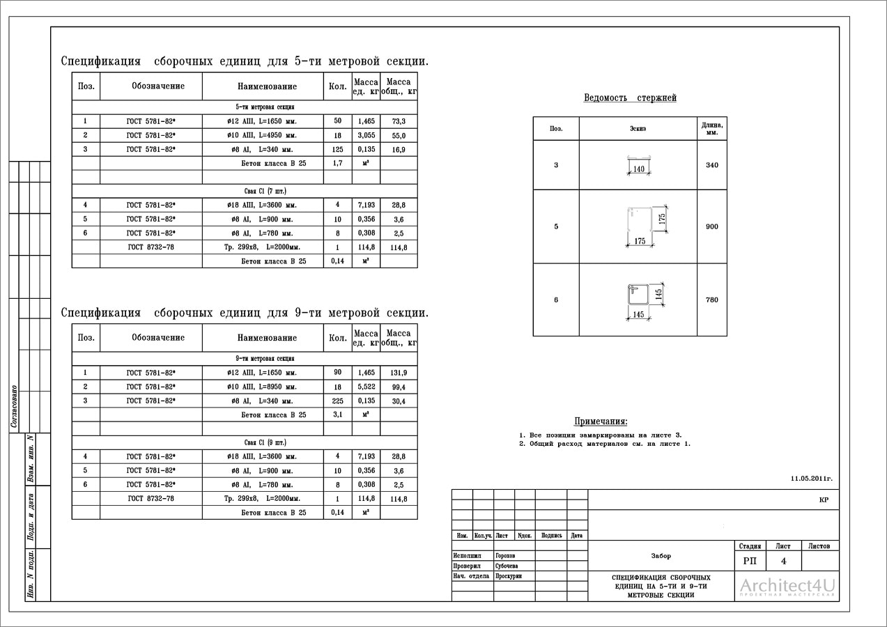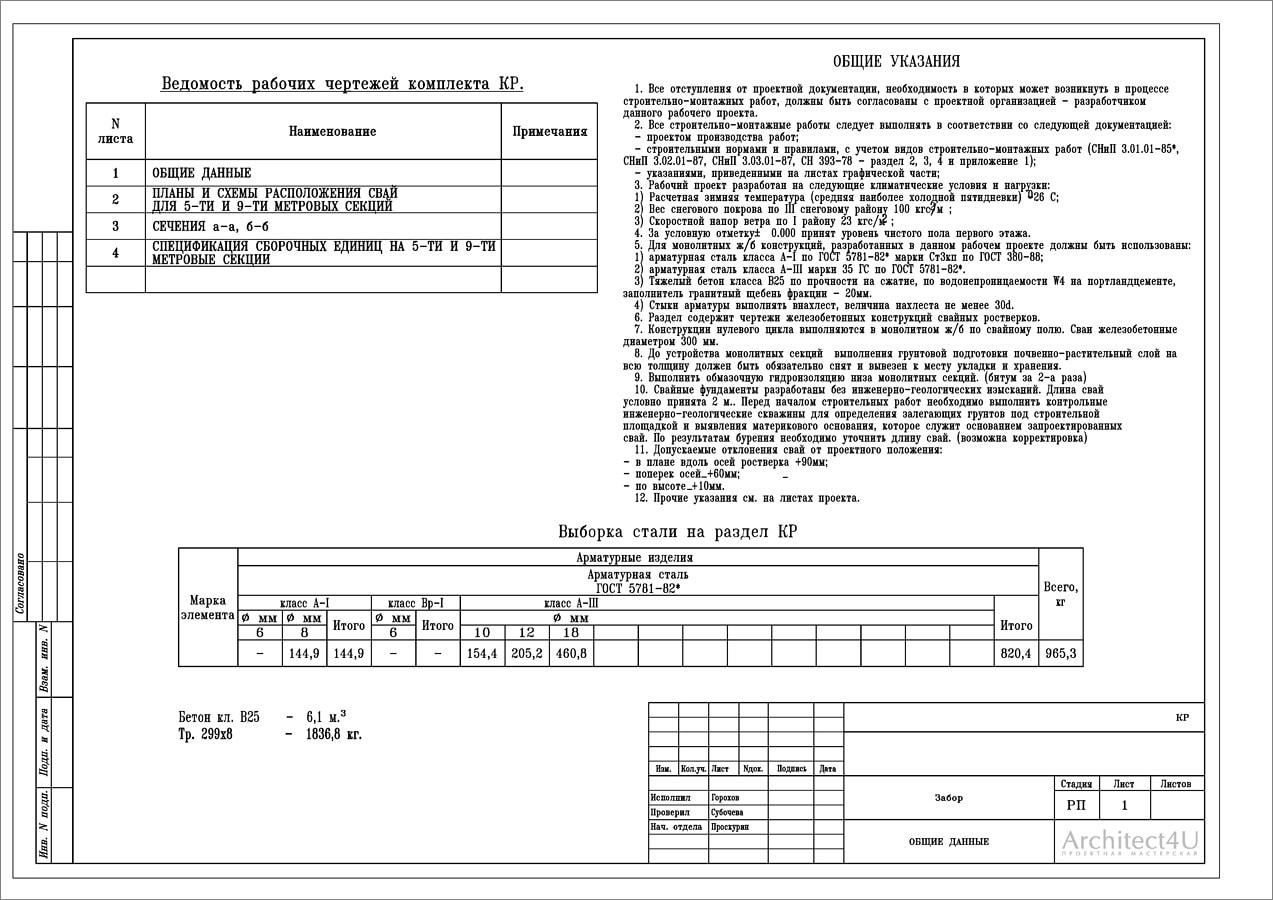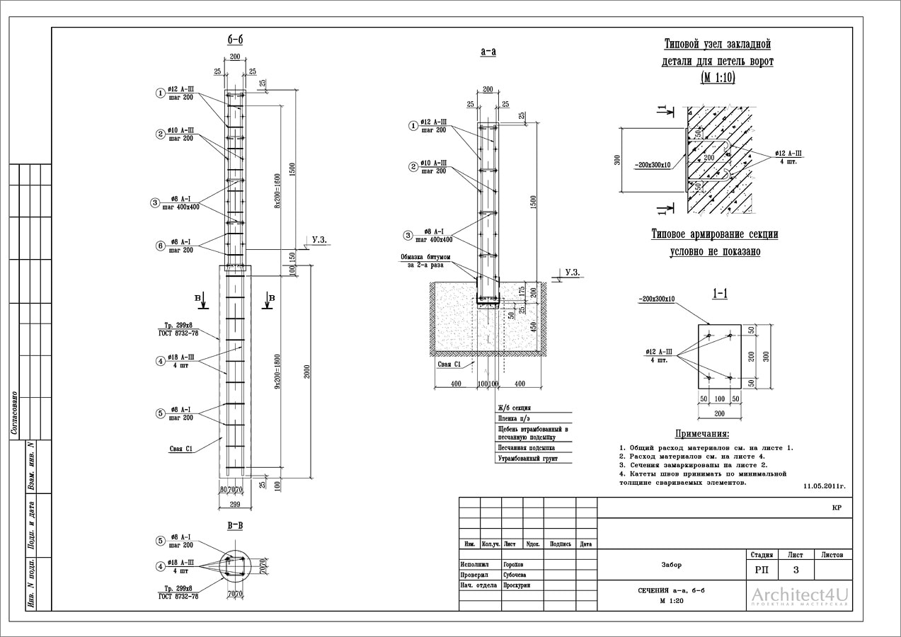 Проект конструктивных решений включают в себя определение оптимального типа фундамента на основании данных геологии и архитектурных параметров забора (ограждения участка). В разделе КР также показаны сечения, узлы, схемы армирования всех несущих элементов - ростверк, столбы, балки и т.д. Ведомости и спецификации всех используемых материалов относятся к обязательным данным рабочего проекта.